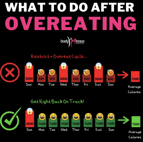 So, what should you do if you overeat? The answer is simple: get back on track with your next meal. Don’t try to recover, fix, or punish yourself for living life. All you did was eat a bit more than usual, and all you need to do is return to your regular routine.